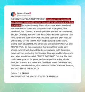 “Pada titik itu, perang akan dianggap telah berakhir. Secara resmi, Iran akan memulai GENCATAN SENJATA, dan pada jam ke-12, Israel akan melakukannya. Pada jam ke-24, akhir resmi dari PERANG 12 HARI akan disambut dunia,” tulis Trump.