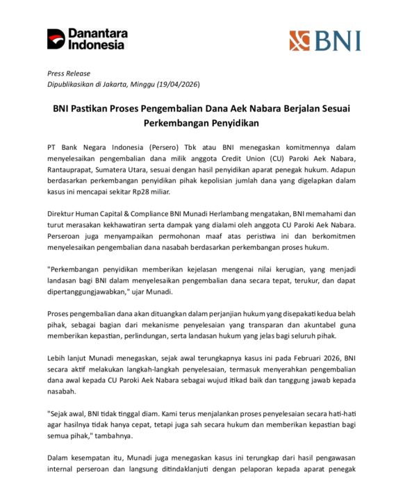 RajaOpera, Jakarta – Kasus dugaan penggelapan dana yang mengguncang masyarakat akhirnya menemui titik terang. PT Bank Negara Indonesia (Persero) Tbk atau BNI memastikan proses pengembalian dana milik anggota Credit Union (CU) Paroki Aek Nabara, Rantauprapat, Sumatera Utara, kini berjalan serius dan terarah mengikuti perkembangan penyidikan aparat penegak hukum.