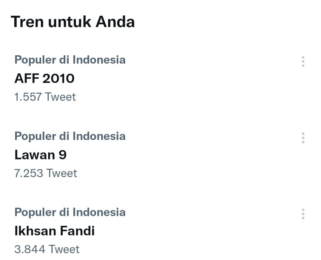 Yang menarik, setelah Indonesia sukses melaju ke babak final, tiba-tiba “AFF 2010” menjadi trending topic media sosial twitter di Indonesia. Hingga Minggu (26/12/2021) pukul 13.57 WIB, “AFF 2010” sudah di-tweet sebanyak 1.503 kali.